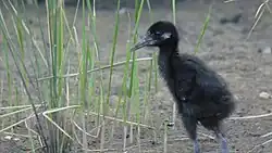 The king rail lays a clutch of 6 to 14 pale buff eggs with brown spotting. They usually measure 41 by 30 millimetres (1.6 by 1.2 in). Both parents incubate the eggs for 21 to 23 days. When the eggs hatch, the young are covered in down and are able to leave the nest. They are not able to feed themselves, though, and thus must rely on their parents for food for up to six weeks after they hatch.[3]