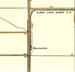 The Kings Lake Shore Railroad was a 19.4-mile (31.2 km) common carrier railroad that operated in Kings County, California from 1910 to 1934. The line primarily hauled agricultural products that grew in this region of the San Joaquin Valley. The line originated with a connection with the Atchison, Topeka and Santa Fe Railway at Corcoran and then ran south-southwest to its terminus at Liberty Farms.