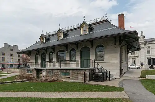 Because of its position at the midpoint of the Toronto-Montréal mainline, Kingston's Outer Station[4] survived as the primary rail station in the area from the line's opening in 1856 until the current station opened in 1974. The station consisted of a stone building (1855) and a brick building (1895–1898) arranged around a curve in the main tracks and joined by a covered platform. The main 1855 limestone station exhibited some similarity in design to Belleville station (220 Station Street, used from 1856 to 2012) as one of a rare few original GTR wayside stations with an added second storey. An 1859 plan shows additional buildings including wood sheds, engine houses, a freight house and a refreshment saloon, which have long been removed.[5]