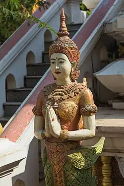 In Cambodia, the kinnaras are known in the Khmer language as kenar (កិន្នរ, កិន្នរា; IPA: [keˈnɑː] or IPA: [ken nɑ ˈraː]). The female counterpart, the kinnari (កិន្នរី; IPA: [ken nɑ ˈrəj]), are depicted in Cambodian art and literature more often than the male counterparts. They are commonly seen carved into support figurines for the columns of post-Angkorian architecture. Kinnari are considered symbols of beauty and are skilled dancers.[6]