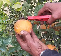 Kinnow fruit seeds are planted between August and October. Harvesting starts when the fruit's external colour becomes orange, from December to February. The best harvesting time is mid-January to mid-February, when the fruit attains a TSS/acid ratio of 12:1 to 14:1. The fruit quality declines in later pickings. Fruits are harvested by clipping the stem with the help of sharp clippers (secateurs). The stem is cut as short as possible to avoid mechanical injury to the fruit in packing and transits. As it is a comparatively loose rind fruit, harvesting by pulling fruits with one's hands is avoided. Coating kinnow fruits with commercial waxes can increase the shelf life up to 60 days. The fruit can be stored in cold storage at a temperature of 4–5 °C (39–41 °F) and a relative humidity of 85–90%.[13]