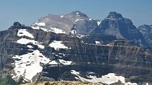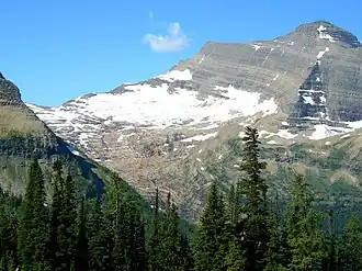 Kintla Peak (10,106 ft (3,080 m)) is a pyramidal peak in the Livingston Range of Glacier National Park in the U.S. state of Montana.[4] It is the tallest mountain in the Livingston Range and the third-tallest in the park.[1] It is also the most northerly peak and land area in the contiguous United States above 10,000 ft (3,000 m). The Agassiz Glacier lies below it to the southeast.[4][5]