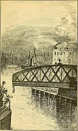 The original railroad bridge was replaced by a swing bridge in 1879 that, along with the Glasgow Railroad Bridge across the Missouri River, was one of the United States' first all-steel railroad bridges.[12] This bridge was constructed from Bessemer steel, which proved too brittle and so the bridge was replaced again in 1898.[1] The replacement bridge was constructed on land and floated into position, allowing the old structure to be removed and the new one put in place in 27½ hours on March 13 and March 14, 1898.[13][14]