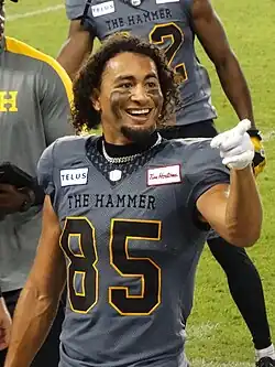 Smith was selected in the fourth round, 37th overall, by the Hamilton Tiger-Cats in the 2022 CFL Draft and signed with the team on May 9, 2022.[3] Following training camp in 2022, he made the team's active roster and made his professional debut on June 11, 2022, against the Saskatchewan Roughriders.[2] He also became the first player born in the 21st century to have played for the Tiger-Cats.[4] Smith recorded his first reception on July 28, 2022, against the Montreal Alouettes in week 8.[2] He then made his first professional start at receiver on August 12, 2022, against the Toronto Argonauts where he had four receptions for 39 yards.[2][4] On September 17, 2022, Smith scored his first touchdown on a 54-yard pass from Dane Evans in a victory against the Winnipeg Blue Bombers.[2][5] He played in all 18 regular season games, starting in eight, where he had 17 catches for 247 yards and one touchdown and one two-point convert.[6]