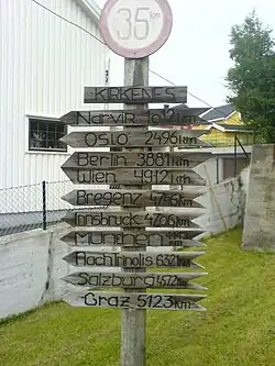 Kirkenes (Norwegian: [ˈçɪ̂rkəneːs] ⓘ), known as Girkonjárga in Northern Sami (pronounced [ˈkir̥ː.ko.ˌɲaːrːka]) and Kirkkoniemi in Kven, is a city in Sør-Varanger Municipality in Finnmark county, in the far northeastern part of Norway.[3] The town lies on a peninsula along the Bøkfjorden, an arm of the large Varangerfjorden, and is located just a few kilometres from the Norway–Russia border.