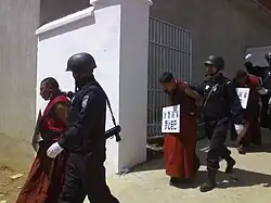 Ngaba Kirti Gompa is under close supervision by the Chinese People's Armed Police.[11] On 16 March 2008, more than 3,300 monks and nuns from the Kirti monastic centers participated in the 2008 Tibetan uprising anniversary demonstrations,[12][13] after which 27 nuns were arrested,[14] and Chinese forces admitted to firing weapons. Between 13 and 30 people were reportedly killed,[15] and the nuns were not heard from after the arrests.