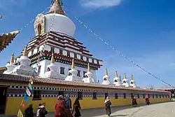 Kirti Gompa is also famous for its 30-metre (98-ft) high white chorten known as the Dudul Chorten which has numerous chapels on the various floors respectively dedicated to Shakyamuni Buddha, Mahakarunika, and the Three Deities of Longevity, Tsongkhapa and Sitatapatra.[2] It the largest Tibetan Monastery in Ngawa Town, and established the Buddhist Youth School, which was closed by Chinese authorities.[8]