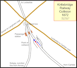The Kirtlebridge rail crash took place in 1872 at Kirtlebridge railway station in Dumfriesshire.[note 1] An express passenger train ran into a goods train that was shunting; 11 people lost their lives immediately, and one further person succumbed later. The cause was a failure to communicate between the station master in charge of the shunting operation, and the signalman. There was not full interlocking of the points, and the block system of signalling was not in use.[1]