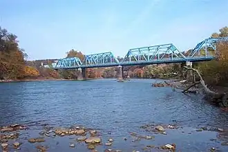 ![]() View across the Kiskiminetas River, looking downstream from the shoreline along Leechburg, Pennsylvania | |