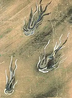 The line's length spans across up to one ri (about 500–600 m).[9] Generally the color of the fire is red or orange,[7] but there have been several examples of witnesses that have seen blue flames.[10]