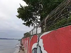 The property is still secured by surveillance cameras and a concrete wall with barbed wire fencing on the seaside. Because of its large size, the latter has been a popular projection surface for political slogans by activists. In the 1970s it was written here in letters tall as a man, so that it could be read even by passenger ferries and cruise ships passing by: "This concentration camp belongs entirely to me (in vernacular)", today it says: "Climate Justice".