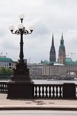 Lombardsbrücke (Lombard Bridge) is the name of the bridge crossing the Alster River at the location of the former Alster glacis, and also the name of the two feeders, built on the former glacis. The feeders are landscaped parks, transitioning between the two Alster lakes. The current Renaissance Revival bridge was designed by Johann Hermann Maack (1809–1868) as a three-bay stone arch bridge and completed between 1864 and 1868. A first bridge at this location dated from the mid 17th century. On the bridge, the view opens up wide onto the Binnenalster, historically the Hanseatic city's "state parlour".