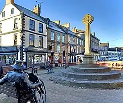 Knaresborough's records claim that a market was first held in the town in 1206, although the town's market charter is from 1310.[1] The market cross in the Market Place is believed to have been constructed in 1709. It was demolished in 1804, with only the steps which had supported it surviving. In 1953, Cecil Naden carved a replacement cross, to commemorate the Coronation of Elizabeth II, and it was placed atop the steps. The cross is alternatively known as the "Buttery" or "Butter Cross".[2][3][4]