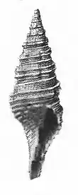 (Original description) The slender, fusiform shells has a moderate size. The aperture is a little less than half as high as the entire shell. The shell contains approximately 11 whorls in the adult, increasing regularly in size. The protoconch is obtuse and rather elevated, thrice coiled. The initial volution is smooth, polished, largely submerged. The succeeding whorls turn inflated but gradually flattening away from the apex. The final turn of the protoconch is compressed laterally, sculptured with crowded asymmetrically arcuate axial riblets, about 20 to the whorl, extending from the posterior suture to the periphery, which is cut off from the anterior suture by a rather deep linear channel. The beginning of the conch is marked by the initiation of 5 spiral lirae, the posterior of which is the broadest, and the anterior, which outlines the periphery, the most elevated. The sculpture is modified on the later volutions by the increasing prominence of the peripheral spiral and that directly behind it, the intercalation of secondaries, and the development of undulatory axials 8 to 10 to the whorl. These are indicated chiefly in the crenulation of the peripheral spirals. The periphery of antepenult whorls is situated a little more than one third of the distance across from the anterior to the posterior suture, outlined by a simple elevated spiral cord. A second spiral of similar character and almost equal elevation is a short distance behind it, the two separated from one another by a shallow interspace in which a medial secondary and two microscopically fine tertiaries are symmetrically intercalated. Both of the peripheral spirals are broadly and regularly scalloped by the axial undulations. The area between the posterior peripheral primary and the posterior suture is feebly concave, lirated with a strongly elevated primary directly in front of the suture and 3 equal and closely spaced secondaries between the posterior primary and the posterior peripheral spiral. A microscopically fine tertiary in some specimens is introduced directly behind the periphery. A strong secondary and two or more tertiaries are usually developed between the anterior peripheral spiral and the spiral upon which the suture revolves. The body whorl in front of the periphery is lirated to the anterior siphonal fasciole with about 12 elevated cords, regular in size and spacing, becoming increasingly less prominent and less distant anteriorly, with 2 to 4 threadlets intercalated between each pair, the medial thread usually the least feeble. The anterior fasciole is also obscurely threaded. The suture line is very inconspicuous. The aperture is mutilated in all available specimens, narrowly pyriform, expanding slightly posteriorly. The outer lip is widely flaring incrementally, narrowly but deeply sinuated in front of the anterior primary, distantly lirated within. The lirae are not persistent to the margin. The parietal wall is thinly glazed, not entirely concealing the lirae upon the base of the body and the columella, which continue far within the aperture. The anterior canal is short, recurved, with parallel proximate margins.[2]