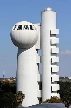 The accelerator building, designed by architect Moshe Harel in Formalist style, was completed in 1976. It has two towers, of 57 and 53 meters high, and an "egg-shaped structure", 22 by 14 meters in its widest points. It became a symbol of the Weizmann Institute of Science.[1][2] It was designed to have "a close resemblance to the original van de Graaff accelerators".[3] It is named after Murray Koffler, who was the first Chair of Weizmann Canada.[4] Now it serves as a conference hall.
