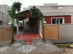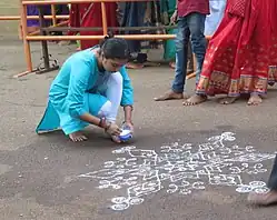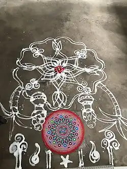Kolam (Tamil: கோலம், Malayalam: കോലം, Kannada: ರಂಗೋಲೆ), also known as Muggu (Telugu: ముగ్గు), Tarai Alangaram (Tamil: தரை அலங்காரம்) and Rangoli (Kannada: ರಂಗೋಲೆ), is a form of traditional decorative art that is drawn by using rice flour as per age-old conventions. It is also drawn using white stone powder, chalk or chalk powder, often along with natural or synthetic color powders. Its part of the South Indian culture and found across all South Indian States. It can be found in some parts of Goa and Maharashtra. Since the South Indian diaspora is worldwide, the practice of kolam is found around the world, including in Sri Lanka, Singapore, Malaysia, Indonesia, Thailand and a few other Asian countries. A kolam or muggu is a geometrical line drawing composed of straight lines, curves and loops, drawn around a grid pattern of dots. It is widely practised by female family members in front of their house entrance, although men and boys also practice this tradition.[1] The similar regional versions of kolam with their own distinctive forms are known by different names in India: raangolee in Maharashtra, aripan in Mithila, alpona in West Bengal and hase and rangole in Kannada in Karnataka.[2] More complex kolams are drawn and colors are often added during festival days, holiday occasions and special events.