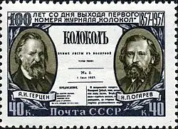 Kolokol (Russian: Колоколъ, lit. 'bell') was the first Russian censorship-free weekly newspaper in Russian and French languages, published by Alexander Herzen and Nikolai Ogarev in London (1857–1865) and Geneva (1865–1867). It had a circulation of up to 2500 copies. Despite being banned in Russia, it was well known and had a significant influence on the reformist and revolutionary movements of the 1860s.[1]