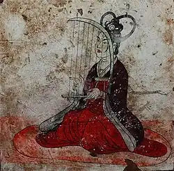 The shu-konghou (豎箜篌) or vertical konghou first appeared in the Eastern Han dynasty (25–220 AD).[2] It can be divided into big and small varieties. The playing of the shu-konghou was most prevalent in the Sui and Tang dynasties.[2] It was generally played in rites and ceremonies and gradually increased in popularity among the ordinary people.[2] It is also the most common type of konghou in Chinese cultural relics, murals and poetry. The Chinese harp refers to this kind of konghou.