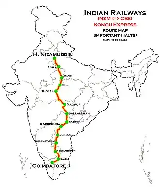 - ^ "Train Schedule of KONGU EXPRESS (12647) with Availability, Fare Calculator, Rake Information, Route Map, Live Running Status and Running History : Etrain.info".