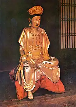The cult of Maitreya was particularly influential in the 6th and 7th centuries of the Three Kingdoms period. Sillan kings styled themselves as rulers of a Buddha land, the King symbolizing the Buddha. This religious adaptation is also exemplified in the Hwarang corp, a group of aristocratic youth who were groomed for leadership in the endless wars on the peninsula. The leader of the Hwarang was believed to be the incarnation of Maitreya, a uniquely Korean adaptation of the religion.[33] Maitreya, it was believed, would ascend to earth as the future Buddha in 56 million years and this believe was incorporated into Silla's desire to unite the peninsula. Japanese records also suggest that Sillan images given to the Sillan Hata Clan are the current Koryo-ji Miroku Bosatsu and the Naki Miroku.[34] The Koryu-ji Miroku, dated to 620–640, is stylistically a Korean image, is made from red pine which is indigenous to Korea, and the technique of carving inward from a single log is a believed to be an ancient Korean wood-working technique.[35][36] The Korean cult of Maitreya, and the major influence of Korean-style pensive images on Japan in the Asuka period.[37] Korean influence on Japanese Buddhist art was very strong during 552–710.[38]