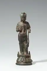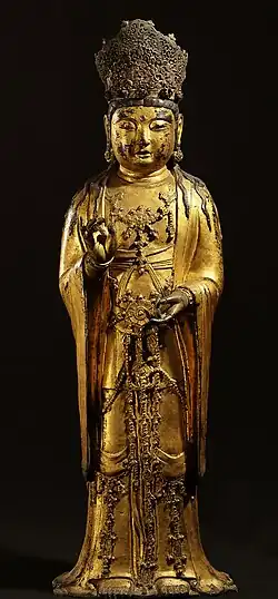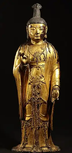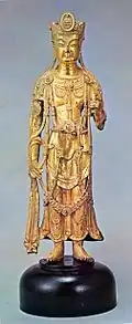 - Standing Bodhisattva with triple head ornament, probably Goguryeo, mid-6th century. Gilt bronze, h. 15 cm. National Museum of Korea, Treasure No. 333.