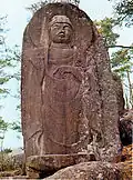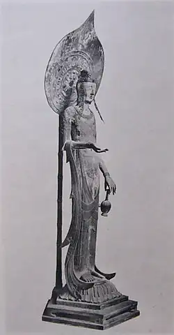 A single-mandorla triad, Hōryū-ji Dedicated Treasure no. 143 now in the possession of the Tokyo National Museum is a particularly fine example of Baekje sculpture in Japan from the 6th or 7th century.[42] The Korean origins of the statue are based on the round and warm faces typical of Baekje style, the absence of an air of solemnity and austerity typical of the Tori style, the casting technique which used nails instead of spacers, and the intaglio effect on the bronze the artisan used to make the eyebrows, a typical Korean technique. The Dainichibo standing Buddha, Sekiyamajinja Bodhisattva, Hōryū-ji Treasure no. 165 may all be from Korea as well.[43] Other possible examples of Baekje sculpture in Japan are the hidden image at Zenkoji (image Archived 2007-07-01 at the Wayback Machine),[44] the Kudara Kannon (literally Baekje Avalokiteshvara) at Hōryū-ji, and the Yumedono Kannon.