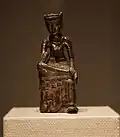 Seated Buddha imagery remained popular during the 6th century in Korea. As mentioned above, an archaic seated Buddha resembling the Ttukseom Buddha was discovered in modern-day Buyeo, a city the Baekje king made his capital in 538. This old style was soon discarded for newer influences. By the second half of the 6th century while sculptors maintained the dhyana mudra they opted to displace the rectangular lion throne iconography for complicated drapery which were depicted cascading over the Buddha's seat. A seated Buddha at the National Museum of Korea while starkly different from its chronological counterpart, the Kunsu-ri seated Buddha from Baekje, in style shows that both kingdoms were adopting this new approach to seated figures. The Goguryeo seated Buddha displays typical Goguryeo traits, such as the rounded ushnisha and head and hands disproportionately larger relative to the body.[16] The depiction of the folds of the robe over a now lost rectangular throne are exuberant with no sense of following a set scheme.[16]