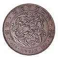 During the introduction of the Korean yang following the adoption of the silver standard, the dates on the coinage still followed the Kaeguk calendar which was based on the founding of Joseon in the year 1392 which was the year Kaeguk 1 (開國元年).[3] But following the proclamation of the Korean Empire in the year 1897 the era names or regnal years of the Emperor of Korea were used instead. King Gojong became Emperor Gwangmu and in the year 1897 the year Gwangmu 1 (光武元年) appeared on the coins.[3] The Gwangmu regnal year was used well after the adoption of the Korean won until the year 1907, when the regnal years changed due to the ascension of Emperor Yunghui making the Gregorian year 1907 into Yunghui 1 (隆熙元年).[3]