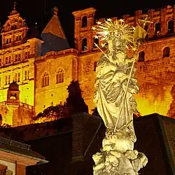 This iconography is based on the motif of "Our Lady of Victory," which became popular in the 17th century in the course of the Counterreformation. In the Heidelberg context, the slaying of the monstrous snake was intended as an allegory for the battle against the Protestant "erroneous belief."[5] Other attributes of the sculpture point to various aspects of the Mary cult: the crown of rays with twelve stars and the lilies recall the Immaculate Conception. Crown and sceptre symbolise Mary's role as queen of heaven. The trampling of the snake and the crescent moon at her feet are symbols of her role as the Woman of the Apocalypse. The putti in the clouds stand for the Assumption of Mary and the rays of light in the clouds are the rays of mercy, which Mary sends to the world.[5]