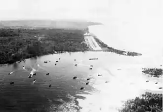 Shortly after midnight, the transport group entered the objective area, but the first landing attempt was hurriedly abandoned when Allied ships were discovered blocking the way. The destroyers headed north again and back-tracked closer to the shoreline for a second try.[12] A small naval force of eight PT boats had been established by the US Navy around Puruata Island, but none of these boats detected the Japanese force.[11] They unloaded the troops about two miles out from the beaches in Atsinima Bay, with the landing forces going ashore in 21 ramped barges, cutters and motor boats. The landing forces were put ashore near the Laruma River and Koromokina Lagoon, 2 to 3 miles northwest of the Marines perimeter, and were initially unopposed. The landing plans had included a bombardment from the naval force; however, because of an Allied fleet nearby, this was not carried out.[12] After the landing, the Japanese destroyers withdrew.[11]