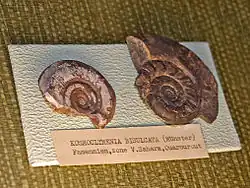 | Fossil of Kosmoclymenia (Muessenbiaergia) bisulcata from Sahara, on display at Galerie de paléontologie et d'anatomie comparée in Paris | |