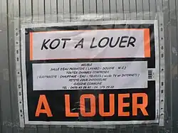 A kot (diminutive kotje) is a type of student housing privately rented during the academic or school year in Belgium. The word kot is used in both Belgian Dutch and Belgian French, but not in standard Dutch or standard French.
