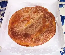 Kouign-amann (/ˌkwiːn æˈmɑːn/; Breton: [ˌkwiɲ aˈmãn]; pl. kouignoù-amann) is a sweet, round Breton laminated dough pastry, originally made with bread dough, but is also made with laminated viennoiserie dough,[1] containing layers of butter and incorporated sugar, similar in fashion to puff pastry albeit with fewer layers. It is slowly baked until the sugar caramelizes and steam from the water in the butter expands the dough, resulting in its layered structure. A smaller version, kouignette, is similar to a muffin-shaped, caramelized croissant.