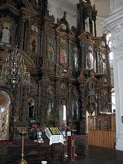 The town's main cathedral and architectural attraction is the Cathedral of the Nativity of the Blessed Virgin. The cathedral was built in the mid-eighteenth century in the late Ukrainian Baroque style by architects Ivan Hryhorovych-Barskyi and Andrei Kvasov.[16][17] Funds for the construction of the cathedral were provided by Alexey and Kyrylo Rozumovsky (the latter was appointed Hetman in 1750).[17]