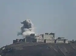 The Syrian Civil War began in 2011, prompting UNESCO to raise concerns that the war might damage cultural sites including Krak des Chevaliers.[53] The castle was shelled in August 2012 by the Syrian Arab Army, damaging the Crusader chapel.[54] It was damaged again in July 2013 by an airstrike conducted by the Syrian Arab Air Force during the Siege of Homs,[55] and once more on 18 August 2013. The Syrian Arab Army captured the castle and village after the Battle of Hosn in March 2014. Since then, UNESCO has published periodic reports about the state of the site, reconstruction and conservation measures.[56]