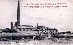 Kramatorsk came into being in the second half of the 19th century when a station on the Kursk-Kharkiv-Azov Railway.[8] The station was originally called Kram-na-Tore in 1868 but this was later contracted into Kramatorsk and the town of Kramatorsk developed around the railway station,[5] becoming a major urban settlement in the north of Donetsk Oblast with several heavy machine production facilities. In 1885 in area were found deposits of chaulk, sand, sandstone, valuable clays, mineral dyes which provided construction of building materials.[5] In 1887 Belgian investors (Stertzer and Sons) built a factory of refractory materials near Kramatorsk rail station. In 1896 the German firm "W.Fizner and K.Hamper"[6] opened a machine factory manufacturing its products for local mining and rail industries.[5][6] The factory was also producing its own metal. Just before the 1905 Russian Revolution, during the 1901-1904 production of cast iron at the factory tripled and accounted for 4.5 millions of poods. Number of employed workers at the factory has doubled during that period (1900-1904) to some 1,460. The workers of the factory were peasants hired from nearby villages, while managing personnel was predominantly foreigners.[6] During the Soviet period that factory was known as the Old Kramatorsk Machine-Building Plant.[5] A factory worker for one 11-12 hour work day was receiving around 70 kopecks to 1 ruble and 10 kopecks. A primary medical institution for the factory was a regional hospital in Sloviansk (about 15 km (9.3 mi)), while in Kramatorsk was a small local clinic with no more than 12 beds. At that time around the settlement appeared smaller iron shops that belonged to Vykov merchants. Employed at least 70 craftsmen, they were producing plowshares, horseshoes, shovels. The settlement accounted for two steam-powered mills, blacksmith shops, grain crusher mill.[6]