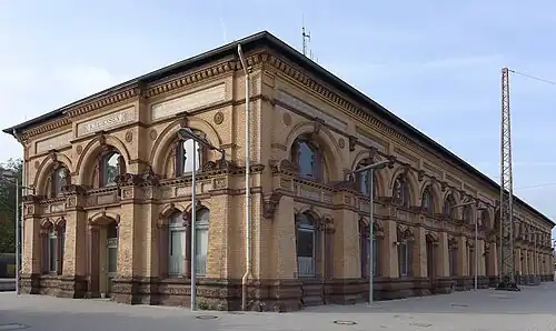 The entrance building was built for the Hanoverian Southern Railway to plans by Hubert Stier in 1886-89. This building from the Wilhelminist period is a brick building with facades covered by tiles. Other elements of shaped stone are found in arched profiles and cornices. Formal design tools are used sparingly on the facades.[14] The cladding with ochre-coloured ceramic tiles is complemented with pillars covered with various terracotta reliefs. Plinths and cornices are made of sandstone. Due to its external monumentality, the building does not reflect the townscape, but instead stresses its importance as a railway junction. It contains a Fürstenzimmer ("prince's room"), which was the location of a meeting between Otto von Bismarck and Tsar Alexander III of Russia in 1889.[15]