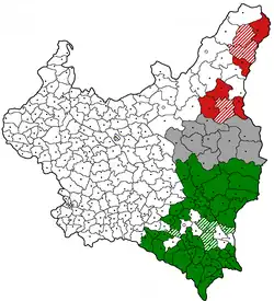 Frequently, whole Kresy villages and towns were deported in a single rail transport to new locations in the west. For instance, the village of Biała, near Chojnów, is still divided into two parts: Lower Biała and Upper Biała. Lower Biała was settled by people who used to live in a Bieszczady village of Polana near Ustrzyki Dolne (this area belonged to the Soviet Union until 1951: see 1951 Polish–Soviet territorial exchange), while inhabitants of the village Pyszkowce near Buczacz moved to Upper Biała. Every year in September, Biała is the scene of an annual festival called Kresowiana.[19] In Szczecin and Polish West Pomerania, in the immediate postwar period, one-third of Polish settlers were either people from Kresy or Sybiraks.[20] In 1948, people born in the Eastern Borderlands made up 47.5% of the population of Opole, 44.7% of Baborów, 47.5% of Wołczyn, 42.1% of Głubczyce, 40.1% of Lewin Brzeski, and 32.6% of Brzeg. In 2011, people with Kresy background made up 25% of the population of the Opole Voivodeship.[21] The town of Jasień was settled by people from the area of Ternopil in late 1945 and early 1946,[22] while Poles from Borschiv moved to Trzcińsko-Zdrój and Chojna.[23] The situation was completely different in Wschowa and its county. In 1945–1948, more than 8,000 people moved there. They came from different areas of the Kresy — Ashmyany, Stanislawow, Równe, Lwów, Brody, Dzyatlava District, and Ternopil.[24]