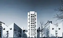 The Kreuzberg Tower and Wings are a complex of three buildings, designed by the American architect John Hejduk. Located close to Checkpoint Charlie, the project was completed in 1988, shortly before the Berlin Wall came down in 1989. It is considered an iconic work of 20th-century architecture, and one of very few that Hejduk realised during his lifetime.