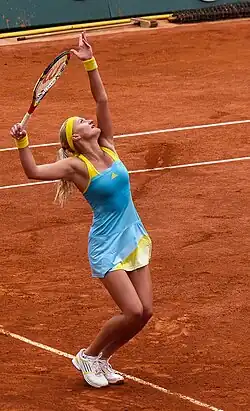 Mladenovic had a disappointing run at the Australian Open in singles, losing in the first round to Ana Konjuh. However, in doubles, reunited with partner Caroline Garcia, she reached the semifinals of the event, where they lost to Andrea Hlaváčková and Peng Shuai.[39] At the St. Petersburg Ladies' Trophy, Mladenovic won her first round match against Elise Mertens before upsetting reigning Australian Open finalist Venus Williams to reach the quarterfinals. She continued her fabulous form against No. 6 seed and defending champion Roberta Vinci, defeating the Italian veteran in straight sets. In the semifinals, the French woman defeated rising player Natalia Vikhlyantseva to reach the first WTA Premier singles final of her career. In a tense final, Mladenovic defeated Yulia Putintseva, 6–2, 6–7, 6–4 to win the first WTA Tour singles title of her career. Mladenovic became the first French woman to win a WTA Premier singles title since Marion Bartoli in Eastbourne in June 2011.[40] In addition, Mladenovic competed in doubles with Daria Gavrilova (this was the first time Mladenovic played with someone other than Garcia in over a year) but the pair were defeated in the semifinals.