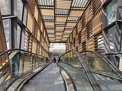 KL Sentral refers to the entire 290,000 square metres (3,100,000 sq ft) of development built on the former Keretapi Tanah Melayu marshalling yard in Brickfields. The development includes the transport hub, hotels, office towers, condominiums and shopping malls and was expected to be completed in 2015.[1] Designed by Japanese architect Kisho Kurokawa, this station uses Malay, English and Japanese languages signs as a tribute.
