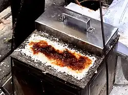 Freshly baked kue rangi just being pulled up from the special metal mold. | |