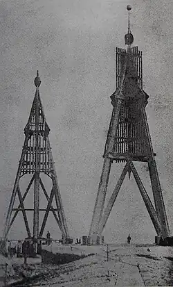 The Kugelbake was also the spot where amateur radio pioneer Jonathan Zenneck experimented with radio communications between the Mainland and ships at sea during the winter of 1899–1900. A wooden hut was built within the structure, equipped with the necessary antennas and technical equipment for the very first coastal radio station in Germany.[5] The first transmissions were sent between the Kugelbake and the steamship Silvana to a distance of 32 km. In the autumn of 1900, transmissions were sent as far as the Elbe Islands and Heligoland, 63 km away.[7]