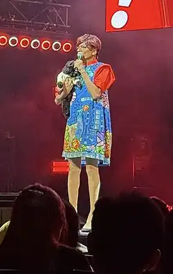 While he first came out to fans as gay in his 2009 performance Kumar: Stripped Bare and Standing Up,[13] Kumar made it official in her 2011 biography.[1] Kumar has hinted at his sexual orientation and gender identity through his comedy routines and televised interviews.[10] he has stated that he is "half man half woman", that he is "more woman than man", and that he has been called out by children as transgender. In Singaporean culture, the "drag queen" identity falls under the transgender umbrella,[14] and a student from the National University of Singapore noted that Kumar was the first transgender celebrity to serve as an ambassador to the annual LGBT Pride event in Singapore called Pink Dot.[14]