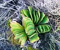 Both species have a unique distichous ("fan") arrangement to their grey, strap-shaped leaves. Both are also indigenous to roughly the same range of mountains in the south-western corner of the Western Cape, South Africa, however the tall tree-like Kumara plicatilis is found on the lower slopes of the mountains, while the tiny stemless Kumara haemanthifolia inhabits the high peaks.