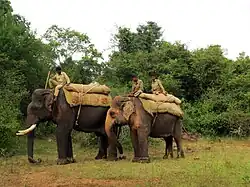 Kumki (Koomkie, Koonki or Kunki; known as Thāppāna in Malayalam) is a term used in India for trained captive Asian elephants used in operations to trap wild elephants, sometimes to rescue or to provide medical treatment to an injured or trapped wild elephant.[1] Kumkis are used for capturing, calming and herding wild elephants or to lead wild elephants away in conflict situations.[2] In such cases the training process aims at preserving some of the wild dominant character in them, so that they can control wild elephants by force if necessary. When wild elephants enter human settlements and kumkis are used to drive them away, sometimes direct physical contact might not be needed since the territorial behaviour is aided by scent and other communication between animals.