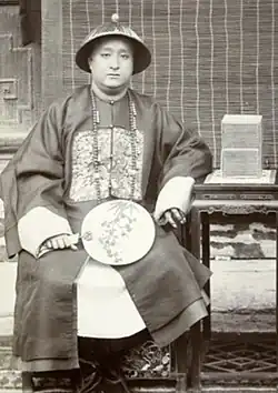 Kong Lingyi had a total of two wives and two concubines. His first wife, Lady Sun (孫氏), was the fifth daughter of Sun Yuwen (孫毓汶, 1833–1899), an Imperial Envoy, and she was one year older than Kong. Lady Sun's grandfather, Sun Ruizhen (孫瑞珍, 1783–1858), was a scholar and official during the Guangxu Emperor's reign. Kong and Lady Sun married in 1888, but she died of illness without issue in 1899, aged 28. Kong's first concubine, Lady Feng, similarly did not have any children, and she died in 1926. Kong's second wife, Tao Wenpu, (陶文譜, known as Lady Tao [陶氏]),[7] was the fifth daughter of Tao Shiyun (陶式鋆), Magistrate of Daming Prefecture, and Kong married her in 1905; compared with Lady Sun, though Tao family was rich at the time, it wasn't as prominent as Sun family.[8] She bore Kong one son who died at the age of three year. As of 1914, one of Lady Tao's maids, named Wang Baocui, became the second concubine of Kong Lingyi; Wang was a daughter from a peasant from Zunhua County, Hebei, and she bore two daughters in 1913 and 1917. On 4 October 1919, Kong Lingyi went to Beijing after receiving news about the death of his father-in-law, Tao Shiyun. Soon afterwards, Kong was afflicted with a subcutaneous ulcer on his back. He died on 8 November 1919 at the Mansion of the Duke of Yansheng (衍聖公府) in Beijing. At the time of his father's death, Kong Te-cheng's mother, Wang Baocui, was five months pregnant, and on 23 February 1920, she gave birth to Kong. Seventeen days later, on 11 March 1920, Wang died.