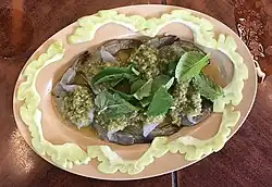 Kung chae nampla (Thai: กุ้งแช่น้ำปลา, pronounced [kûŋ t͡ɕʰɛ̂ː nám.plāː]) is a Thai salad made from fresh raw shrimp soaked in Thai fish sauce and served with chunks of gourd, cloves of garlic, chilies, and spicy sauce.[1] Generally, Thais usually use whiteleg shrimp in this dish.