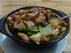 The neighboring province of Guizhou, southeast of Sichuan, has a variant of Kung Pao chicken based on the ciba fermented chili paste (Chinese: 糍粑辣椒 cíbā làjiāo) of Guizhou cuisine. Some literature even lists Guizhou as the origin of this dish.[8] Like the Sichuan version, the dish features marinated cubes of chicken; while the Guizhou marinade is largely the same as the Sichuan version's, the chicken cubes are larger and typically skin-on. Further, rather than flash-frying whole peppers in oil before stir-frying, a large quantity of the ciba chili paste is fried in the wok until the oil is stained. The chicken is then stir-fried in the resulting sauce with garlic, ginger, and green garlic or green onion.[4]