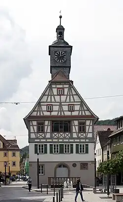 Künzelsau (German pronunciation: [ˈkʏntsl̩sˌʔaʊ] ⓘ; East Franconian: Kinzelse) is a town in Baden-Württemberg, in south central Germany. It is the capital of the Hohenlohe district. It is located on the river Kocher, 19 km (12 mi) north of Schwäbisch Hall, and 37 km (23 mi) northeast of Heilbronn.